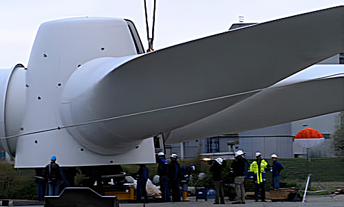 Am 2. Oktober 2004 waren die Rotorblätter an der Nabe montiert und alles wartete auf ein Abflauen der starken Winde, die bereits immer wieder bei den vorherigen Arbeiten störten.