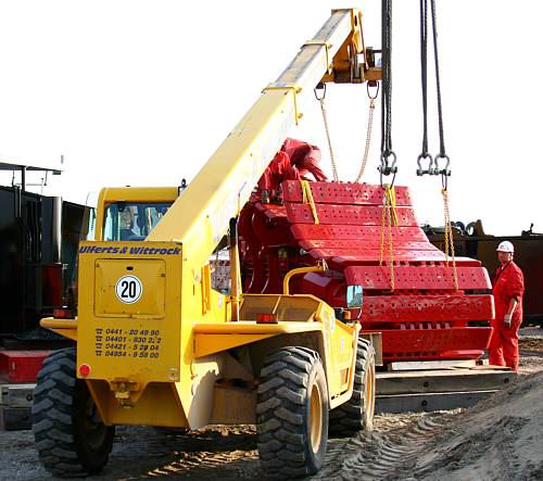 Zur Unterstützung half ein Liebherr LTM von Kronschnabel-Franke dabei, die nötige Position zu erreichen, damit das Verbolzen erledigt werden konnte. Der kleine Stapler wurde von Ulferts und Wittrock geliehen.