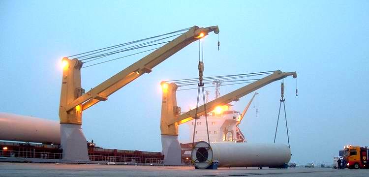 Nachdem in der Nacht das Schiff an der Kaimauer vom Cuxport festgemacht hatte, konnte bei Einsetzen der Morgendämmerung mit dem Entladen der Mastsegmente begonnen werden.