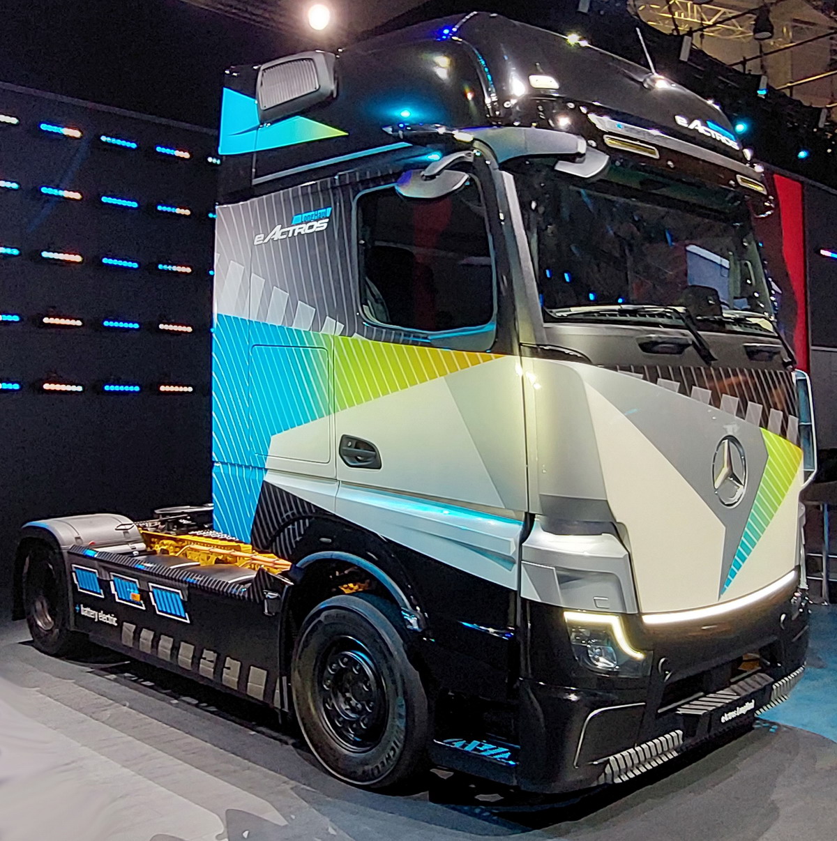 Mit dem "eActros LongHaul" zeigt Mercedes ein Konzept-Prototyp, der ab 2024 in Serie gehen soll. Mit einer Batterieladung sollen bis zu 500 Kilometer machbar sein. Die Ladetechnik für die 600 kwh Batterien mit Lithium-Eisenphosphat-Zelltechnologie (LFP) soll den Ladestand in nur 30 Minuten von 20 auf 80 Prozent bringen. Zwei Elektromotoren liefern eine Dauerleistung von 400 kW (544 PS) und Spitzenleistung von über 600 kW (816 PS).