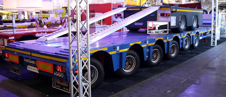 Der Zweiachser mit den Auffahrrampen ist eine Entwicklung in Kooperation mit Mammoet, von denen schon seit dem Donnerstag vor Messebeginn fünf Exemplare auf dem Hof stehen hatten.