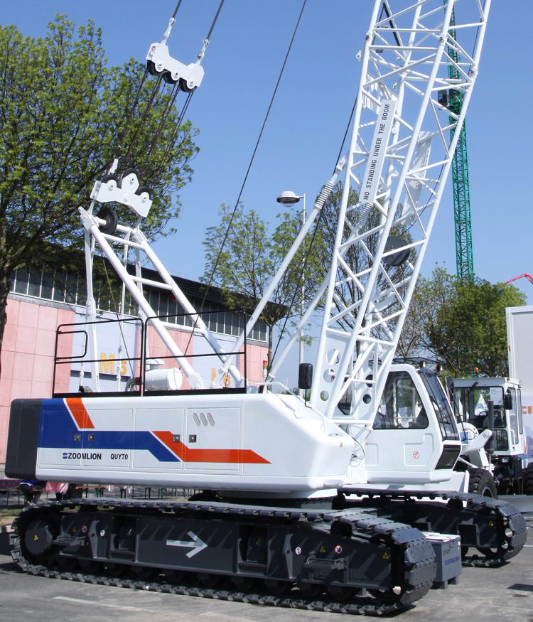 Der Raupenkran QUY70 (Bild unten) hebt maximal 70 Tonnen bei 3,8 Meter Auslage, Die größtmögliche Hakenhöhe beträgt 54 Meter.