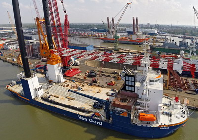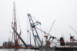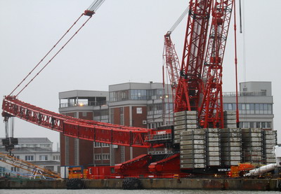 Weiterlesen...Der erste Hub steht an! Leider hingen zeitweise dicke Nebelschwaden über der Baustelle, sodass der Hauptauslger großteils unsichtbar wurde. Als Nachführkran kam der Schwimmkran Matador 3 zum Einsatz.