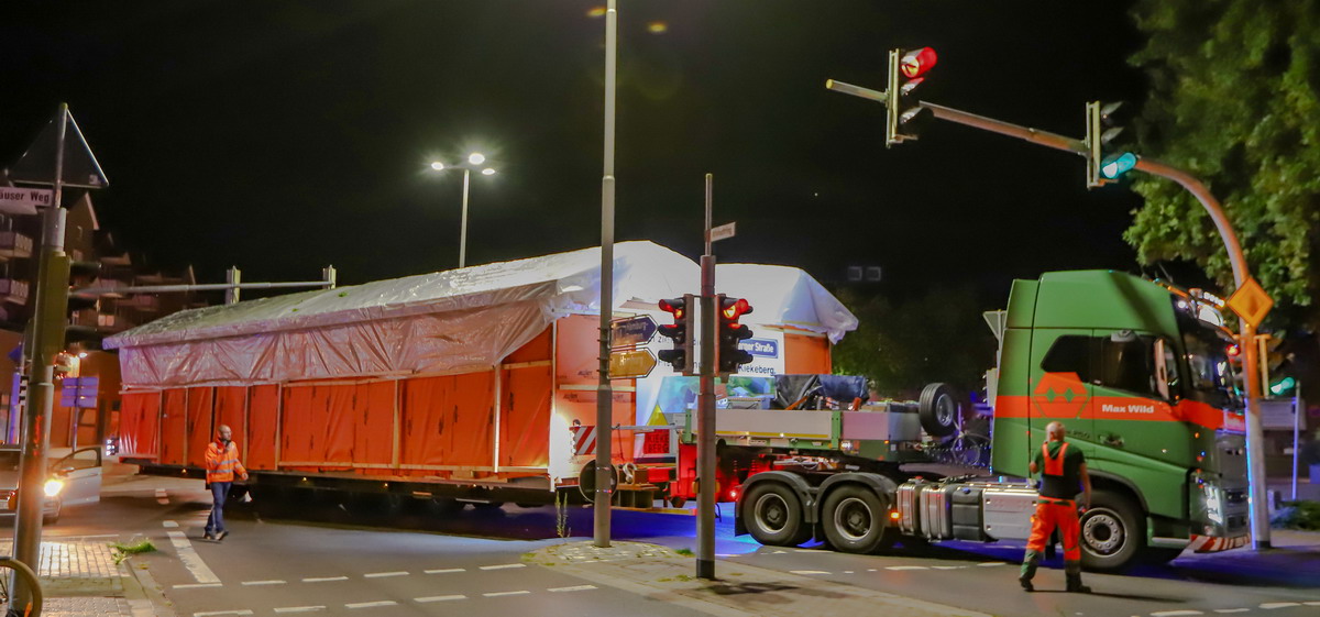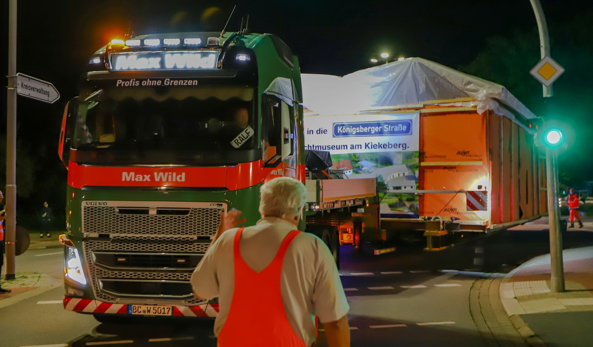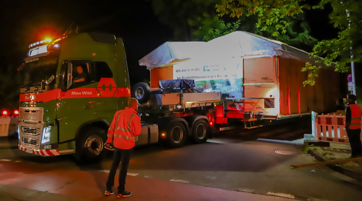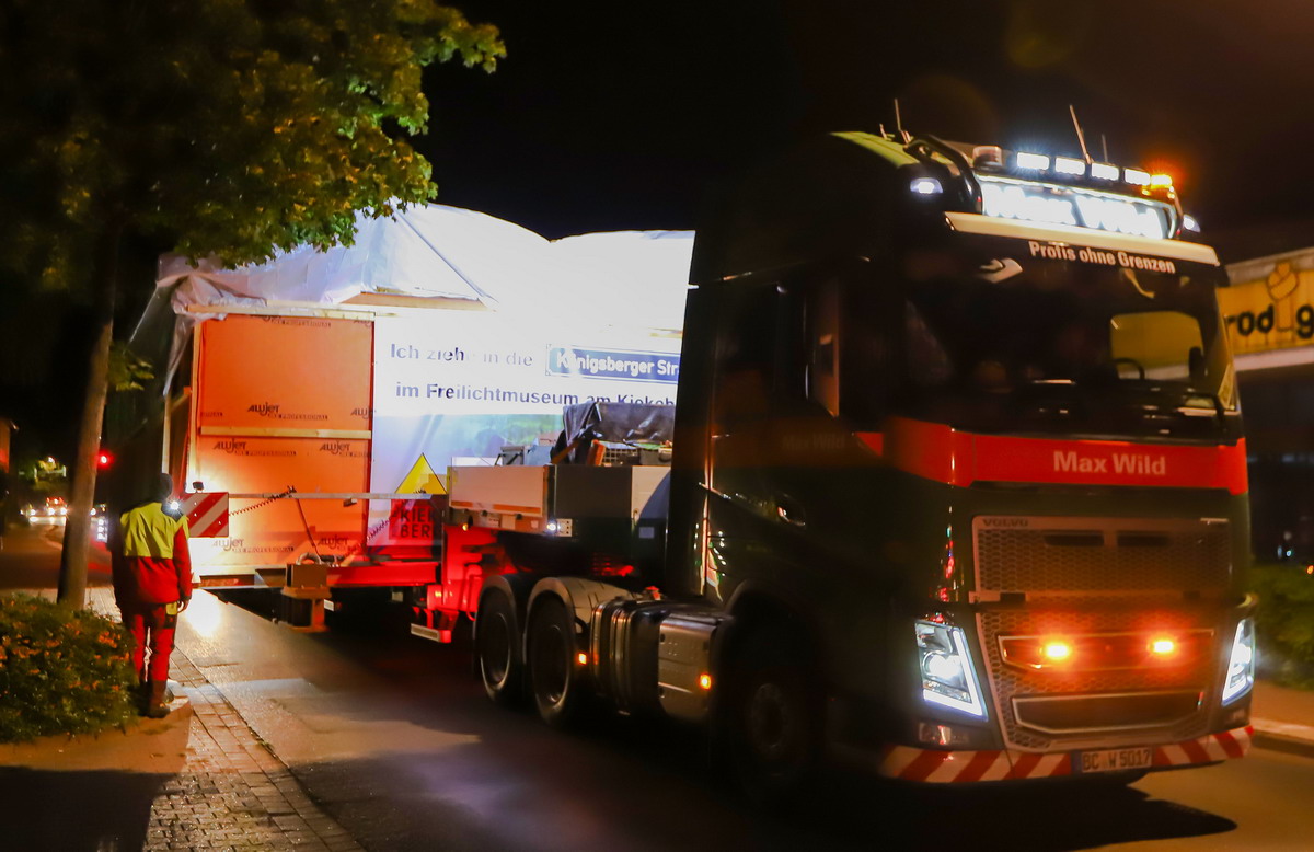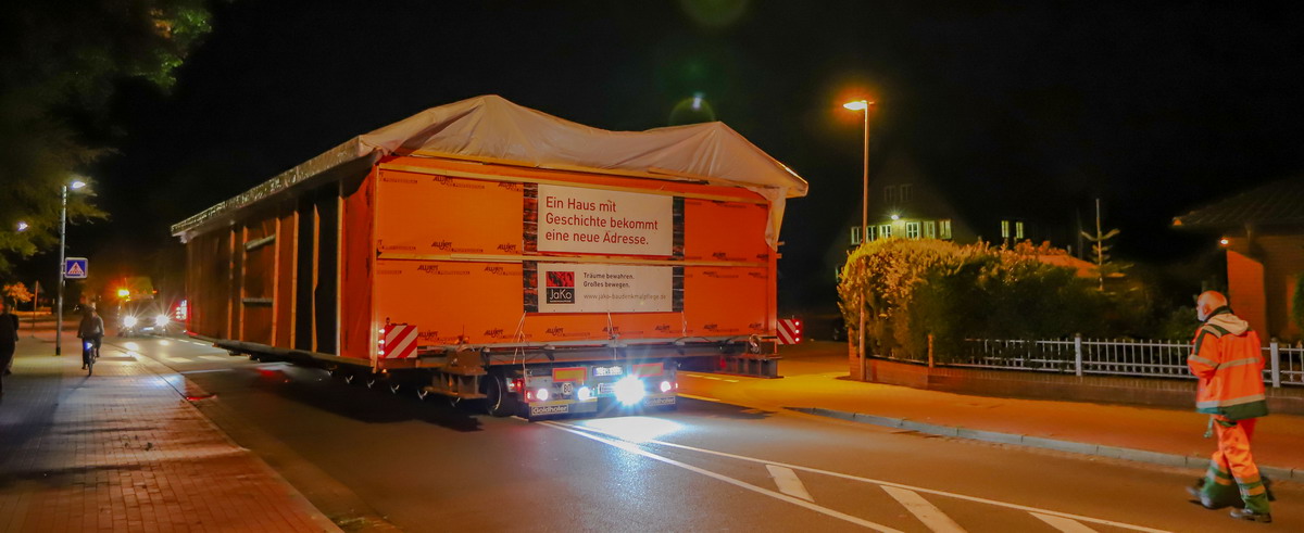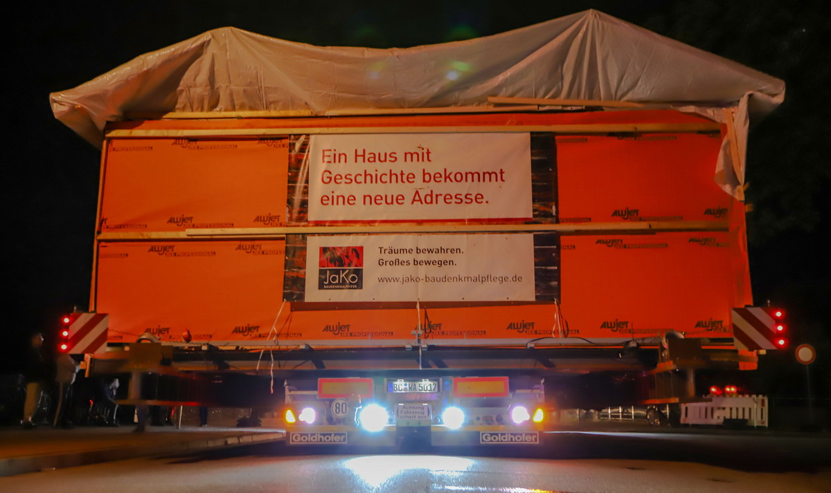 Ein komplettes Haus, abgesehen von der Dachspitze machte sich auf einem Tieflader auf die Reise zum neuen Standort.