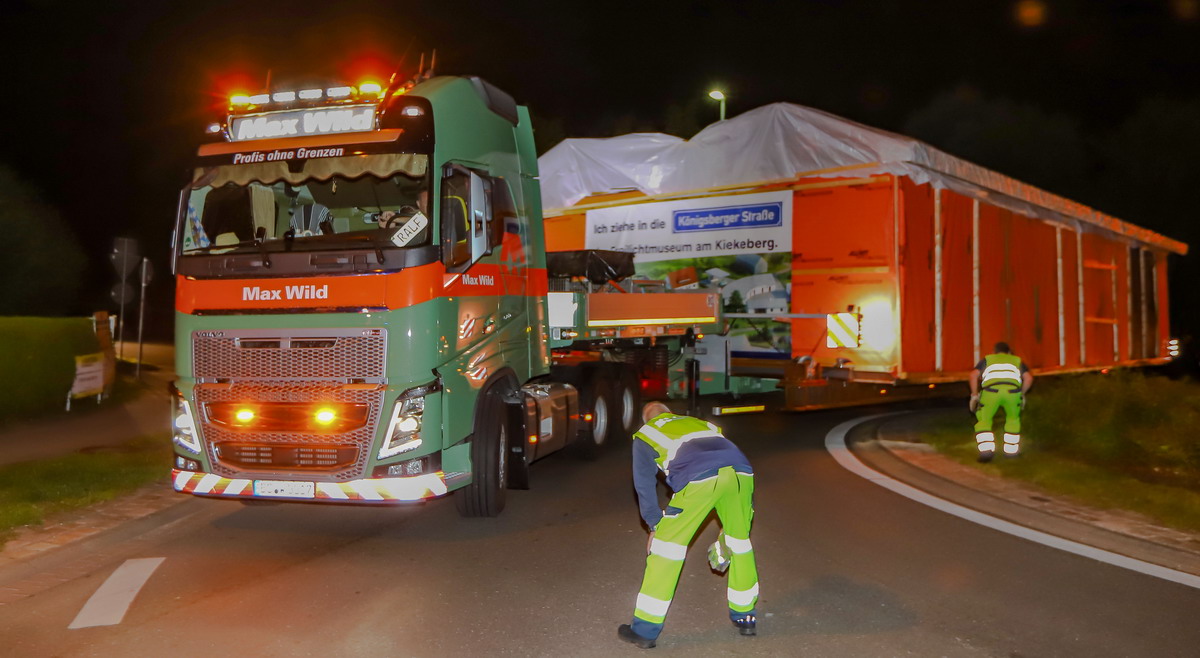 Geschulte Augen an beiden Seiten des Gespanns achten darauf, das Haus unbeschädigt durch sämtliche Nadelöhre zu fahren.