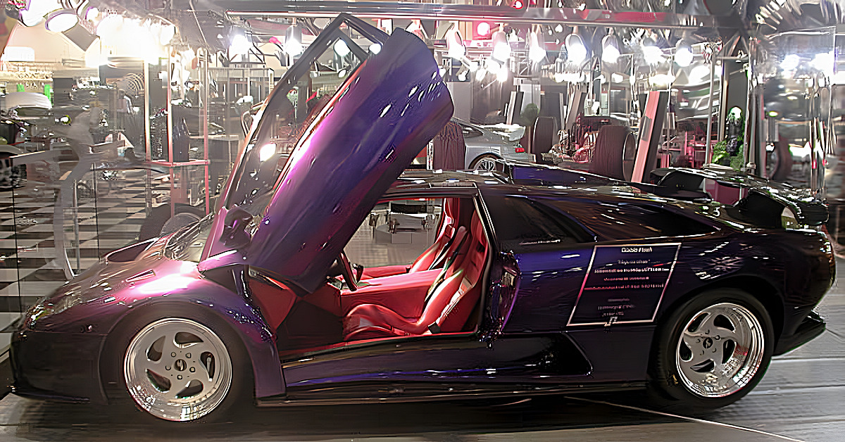 Ein Lamborghini Diablo GT (einer von 80!) wurde hier mit Effektlack veredelt. Die Inneneinrichtung wurde mit rotem Leder aufgewertet und ist nun nicht mehr mit dem Originalzustand zu vergleichen.