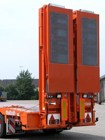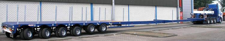 Während in Deutschland die Ladekrane meist fest am Fahrzeug montiert sind, haben viele der neuen Auflieger bei Nooteboom auf der Ladefläche ein eigenes Schienensystem.