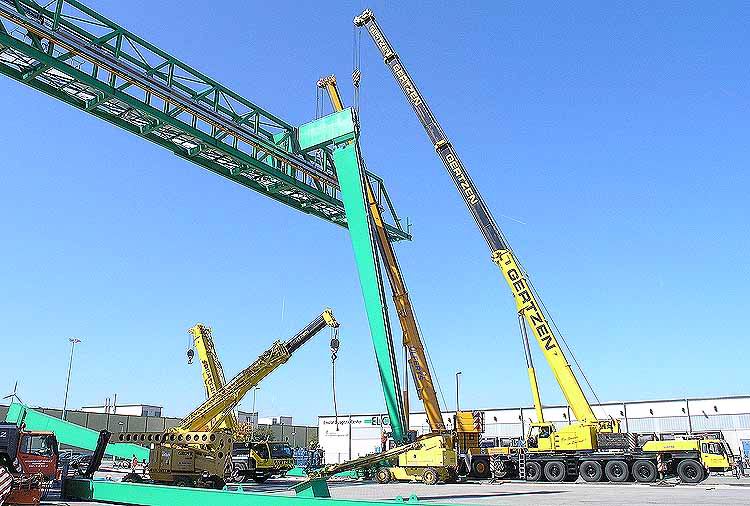 Schon während die Schraubenschlüssel am ersten Bein werkelten, begannen zwei weitere Kräne das nächste Standbein aufzu- nehmen.