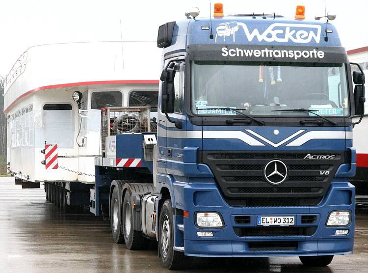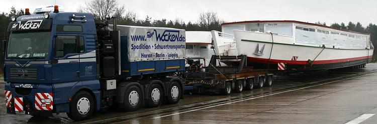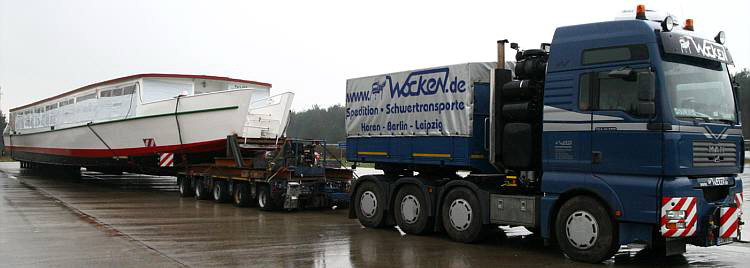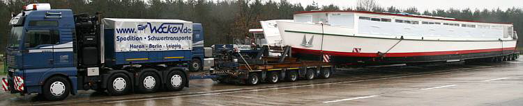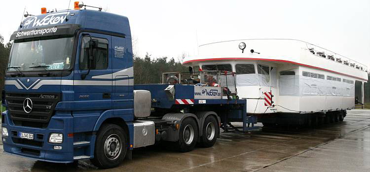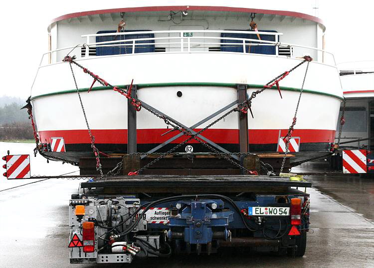 Vom Ratzeburger See in Schleswig-Holstein wurde das Ausflugsschiff als zweigeteilter Schwertransport zum Zwischenahner Meer nahe Oldenburg gefahren.