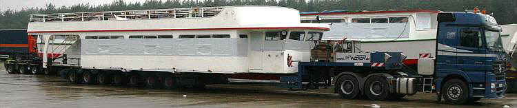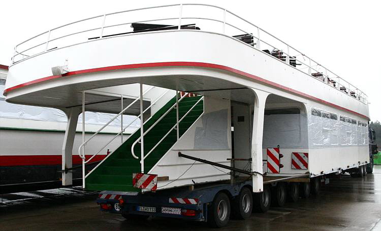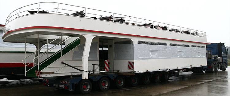 Das Oberdeck des Ausflugsschiffes wurde abgetrennt damit die Transporte auf der langen Autobahn-Passage die vielen Brücken unterfahren konnten.