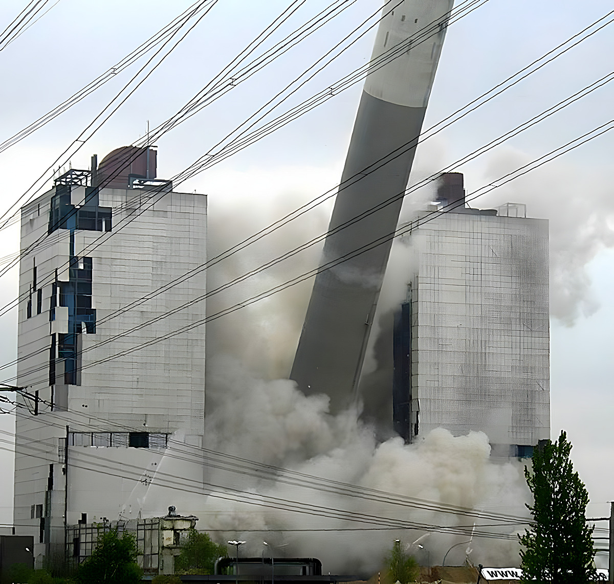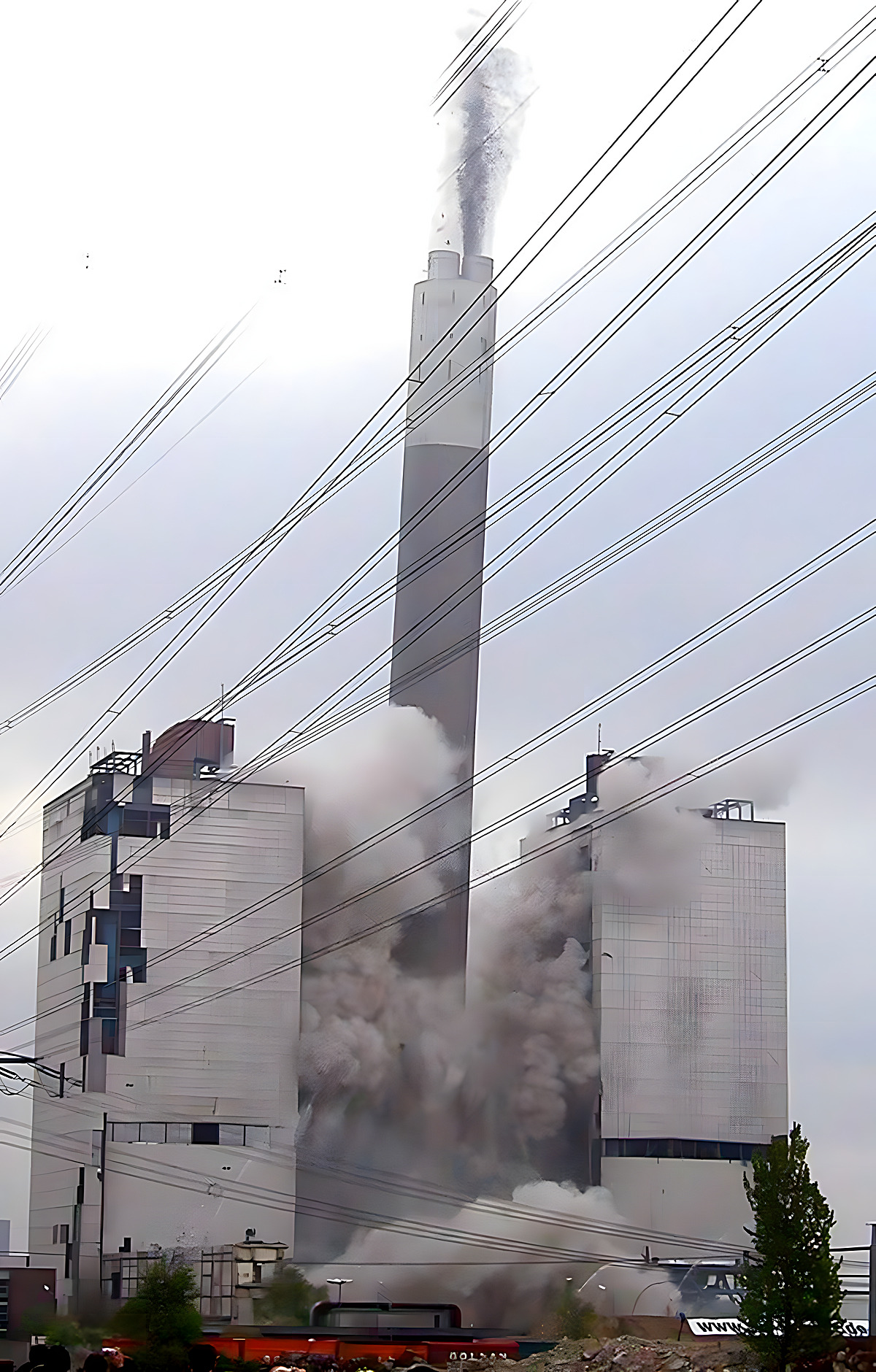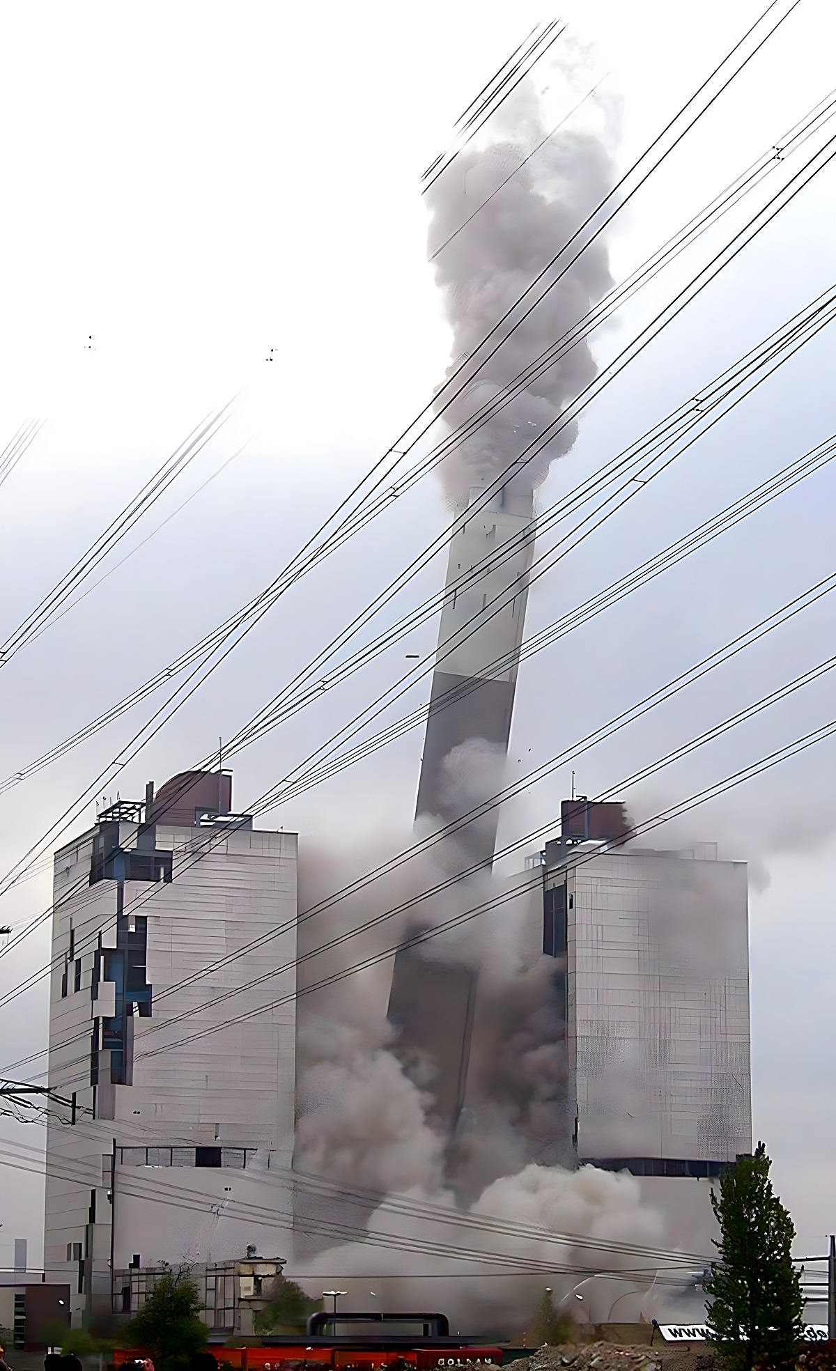 Der starke Luftdruck stießt oben eine Rußwolke herauswährend der Schlot weiter in sich zusammensackte.