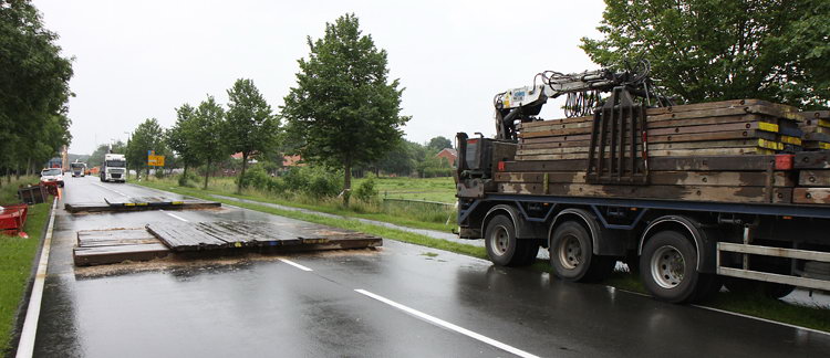 Die längsten Stahlträger wurden mit Sattelschleppern von einem Einsatzort