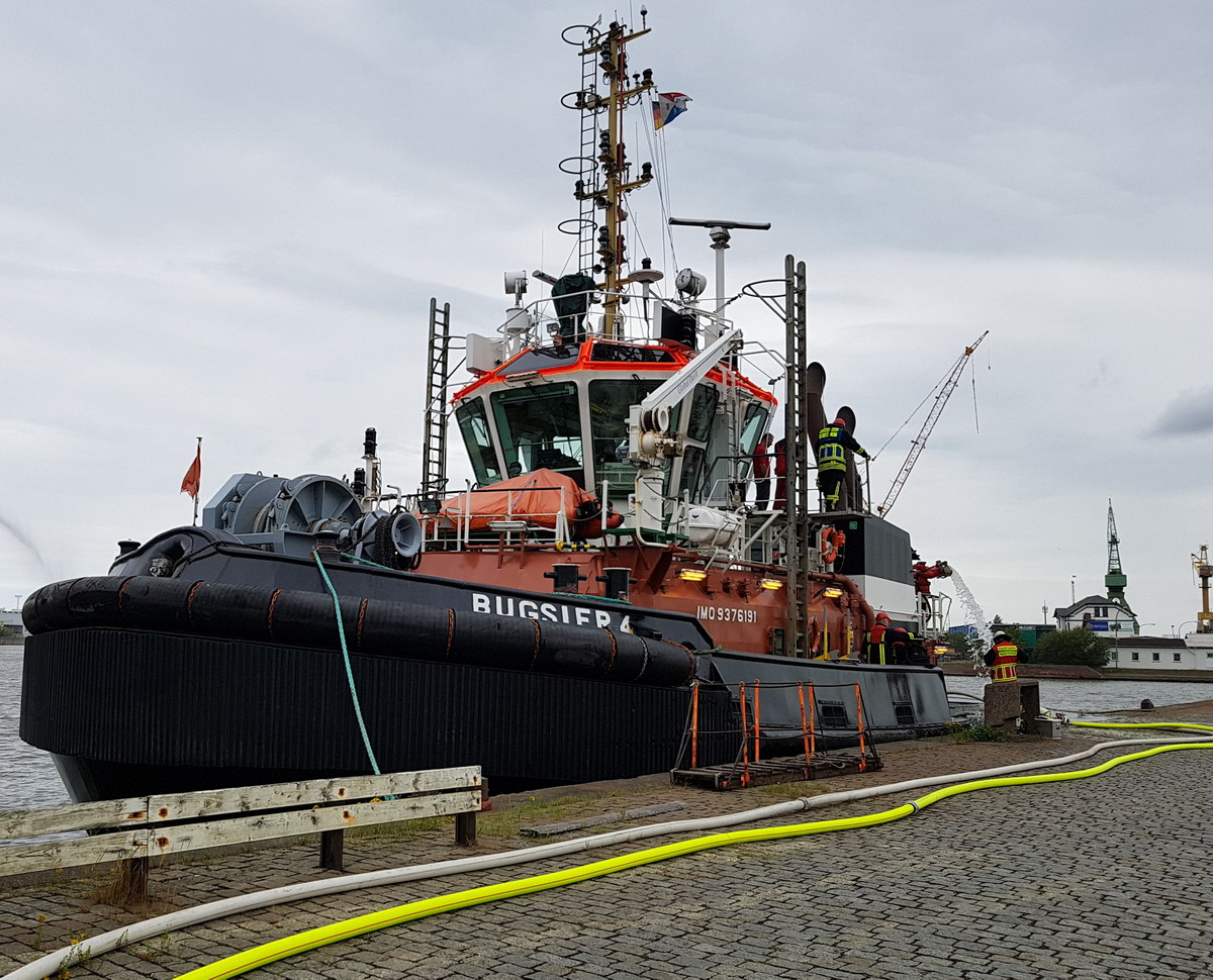 Zurück zur Übung: In einigen hundert Meter Entfernung hatte der Schlepper "Bugsier 4" festgemacht. Dieser wurde mit zwei langen Zuleitungen bestückt, die von hier aus mittels der zwei leistungsstarken Schlepperpumpen Wasser abtransportierten.