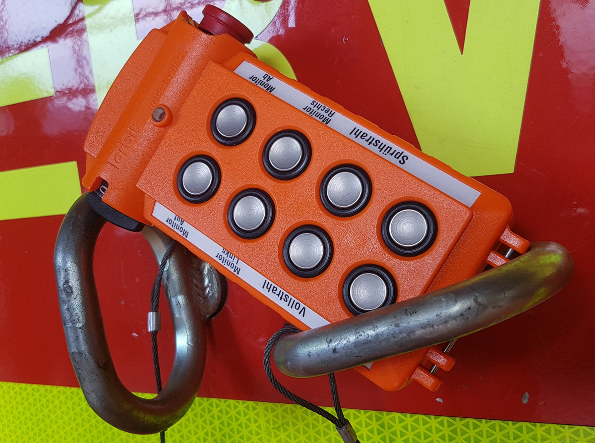 Mit dieser kleinen Fernsteuerung kann der Strahl ausgerichtet und zwischen Sprüh- und Vollstrahl umgeschaltet werden