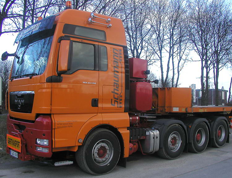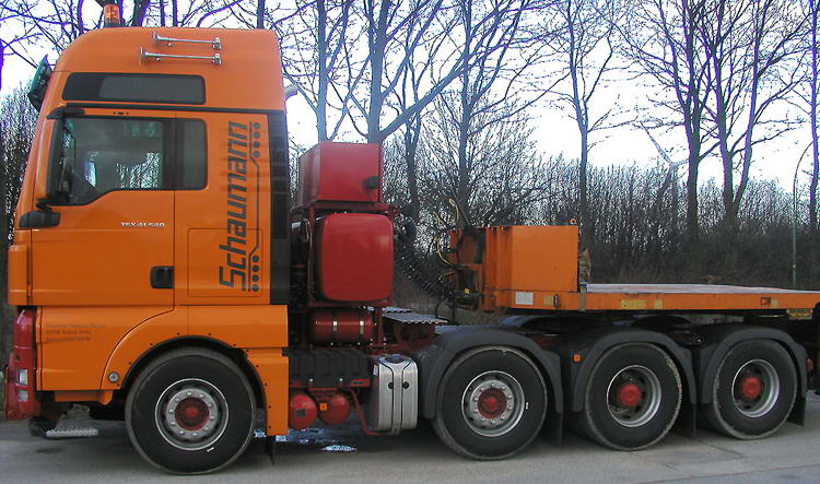 Wie meist üblich bei den schweren MAN-Zugmaschinen im Schaumann-Fuhrpark gibt es keine Staukiste zwischen den Achsen, hier ist oft einfach nur gähnende Leere.