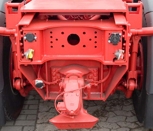 Für den Einsatz mit Ballast- pritsche ist eine Schwerlast- kupplung mit den entspre- chenden Versorgungsan- schlüssen am Heck ange- bracht.