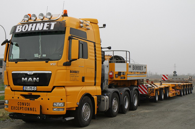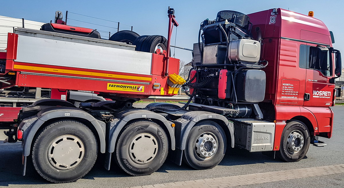 Chrom ! Dieser MAN TGX fällt schon durch die reichhaltige Bestückung mit Chrombügeln und Zusatzscheinwerfern sofort auf. Untér dem Fahrerhaus werkelt...