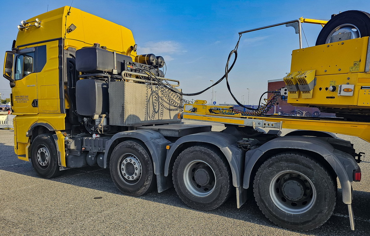 Mitte September 2024 parkte dieses strahlend gelbe Gespann nach dem Entladen im Bremerhavener Hafen.