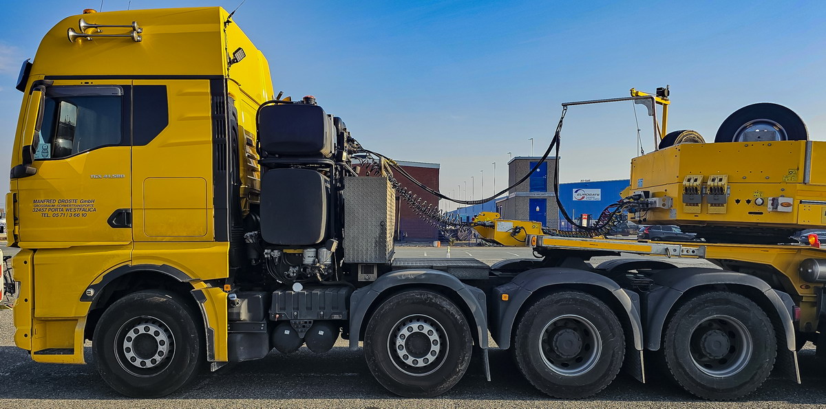 Firmen-Design 2024 Anfang September 2024 wartete dieser MAN TGX 41.640 samt Tiefbett-Auflieger auf Einlass in den den Bremerhavener Hafen. Schon von vorn...