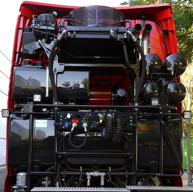 Chrom ! Dieser MAN TGX fällt schon durch die reichhaltige Bestückung mit Chrombügeln und Zusatzscheinwerfern sofort auf. Untér dem Fahrerhaus werkelt...