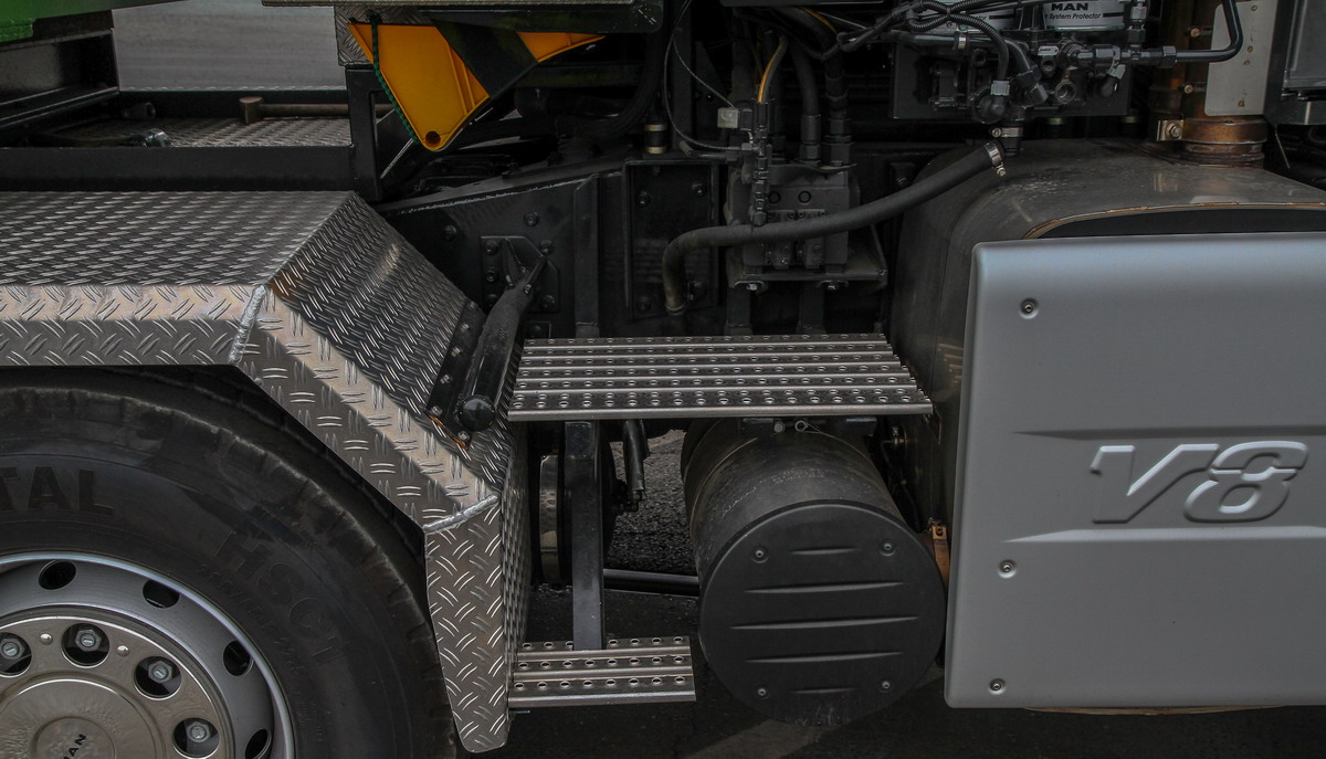 Es gibt hier keine ausziehbare Leiter, sondern Trittstufen, die unter und neben dem AdBlue-Tank eingepasst wurden.