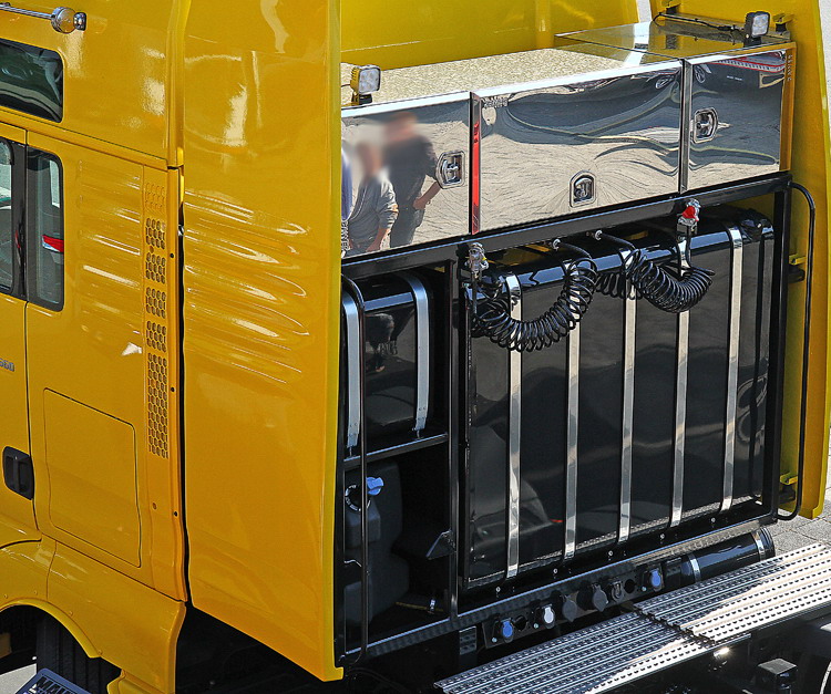 Der hohe, aber schlanke Dieseltank fasst immerhin 1100 Liter Kraftstoff.