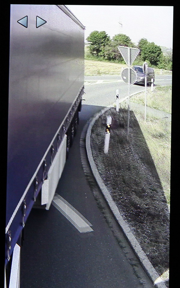 Beim Rangieren dreht sich der kurveninnere Spiegel so mit, dass weiterhin das Heck des Aufliegers sichtbar bleibt.