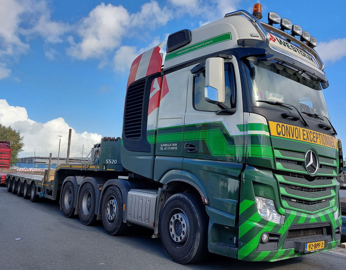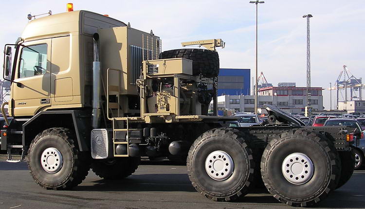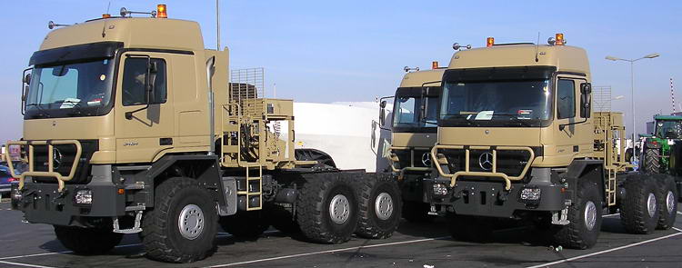 Die extraweiten Spiegelträger verraten schon, daß die Auflieger mit großer Wahrscheinlichkeit zur Klasse der 2,75 oder 3 Meter breiten Panzertransporter gehören werden.