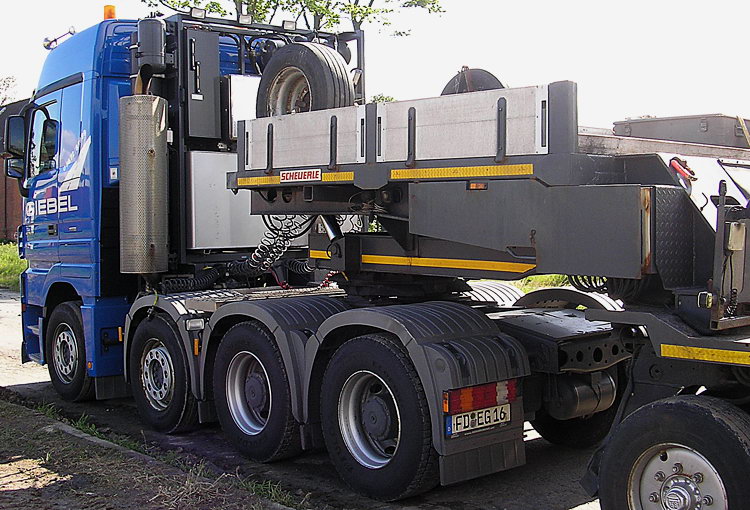 Der kurze Actros ist mit einem schmalen Schwerlastturm ausgerüstet.