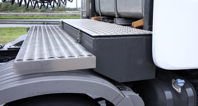 Bei diesem Fahrzeug sind allerdings anstelle der modifizierten Kühlereinheit drei tiefe Staufächer im Schwer- lastturm verbaut worden.