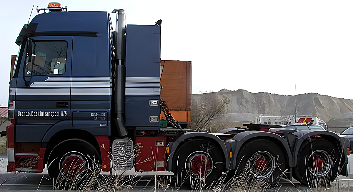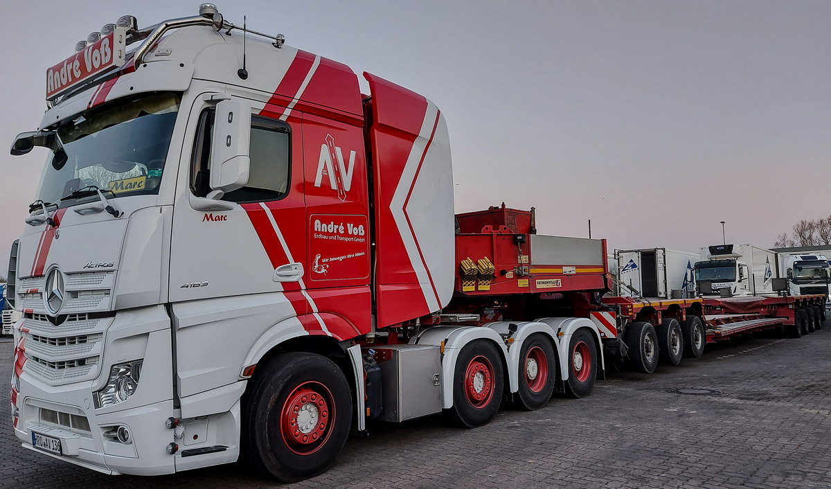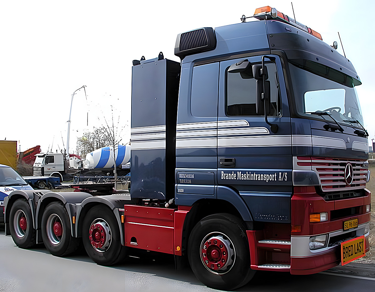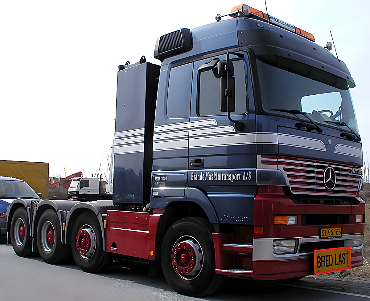 Neben den großen Actros Titan hat Brande Maskintransport A/S aus Dänemark auch 4achsige Mercedes Actros für den mittelschweren Einsatz, die ohne Wandler auskommen.