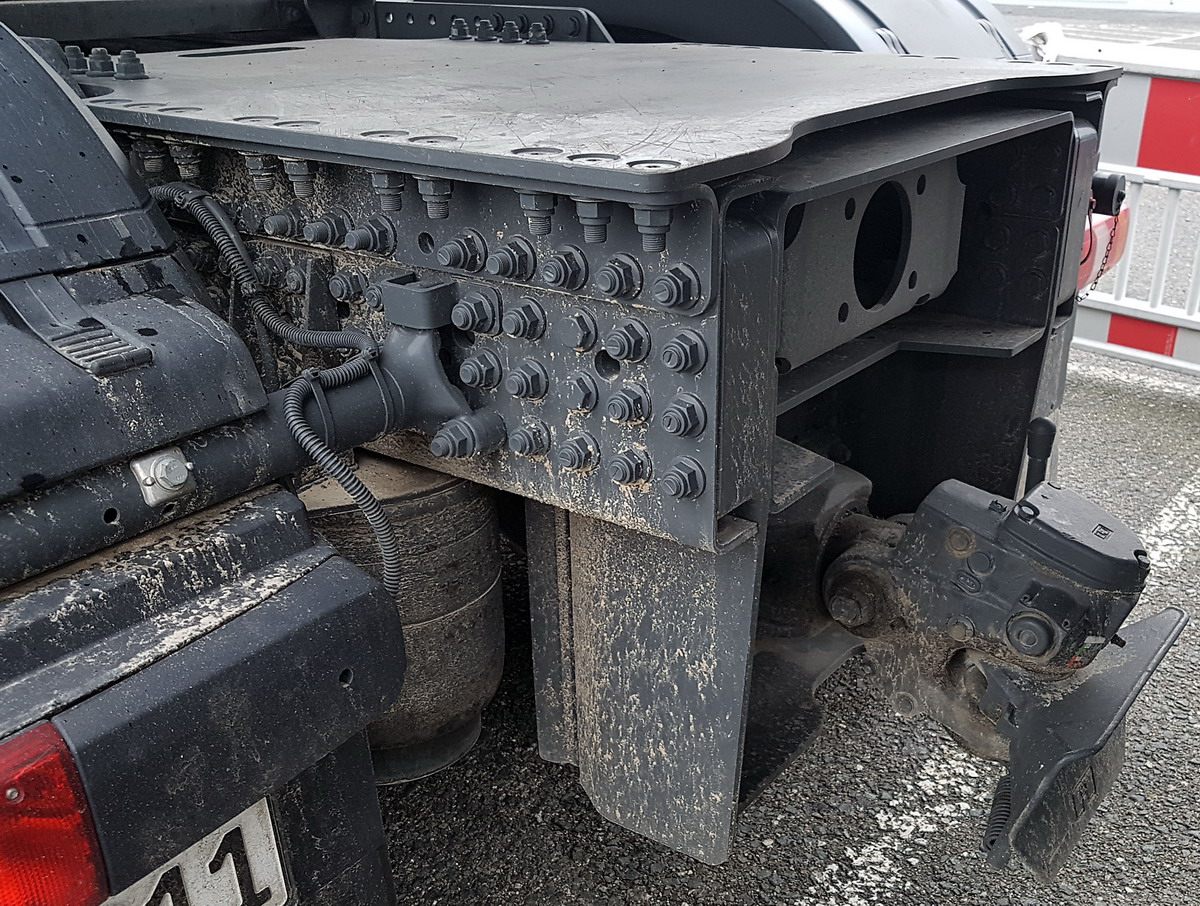An der Front verfügt der Actros SLT 4163 über den Träger samt Registerkupplung für den Einsatz als Schubfahrzeug.