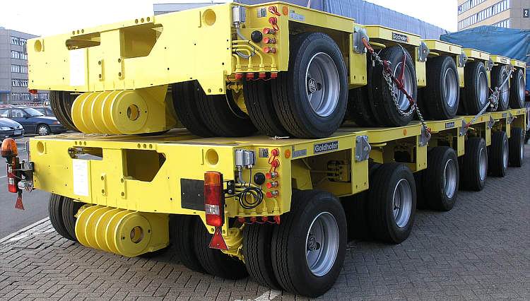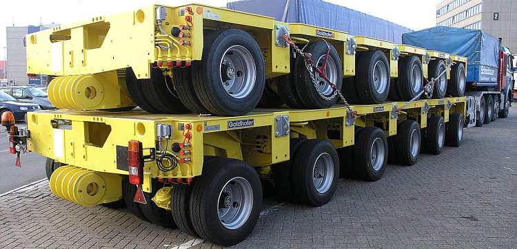 Hier ein Trafo-Transport auf einem 18-achsigen Goldhofer-Gespann.