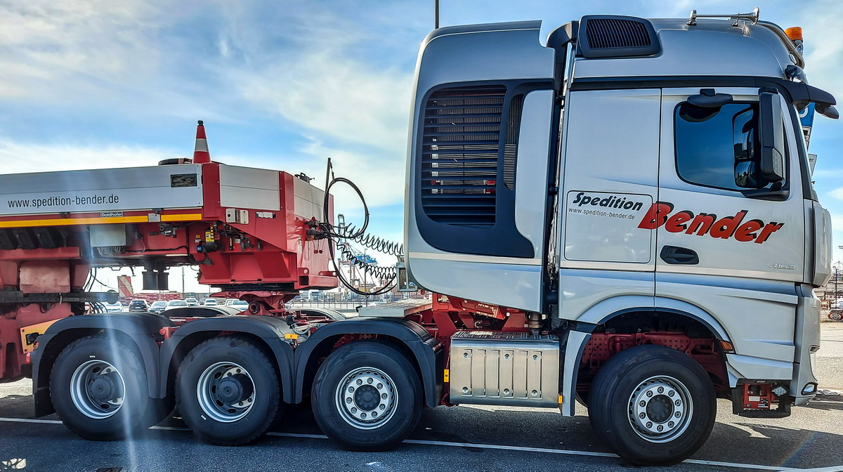 Dabei ist der Vierachser mit dem aufgebockten Fahrerhaus der Arocs-Baureihe bestückt.