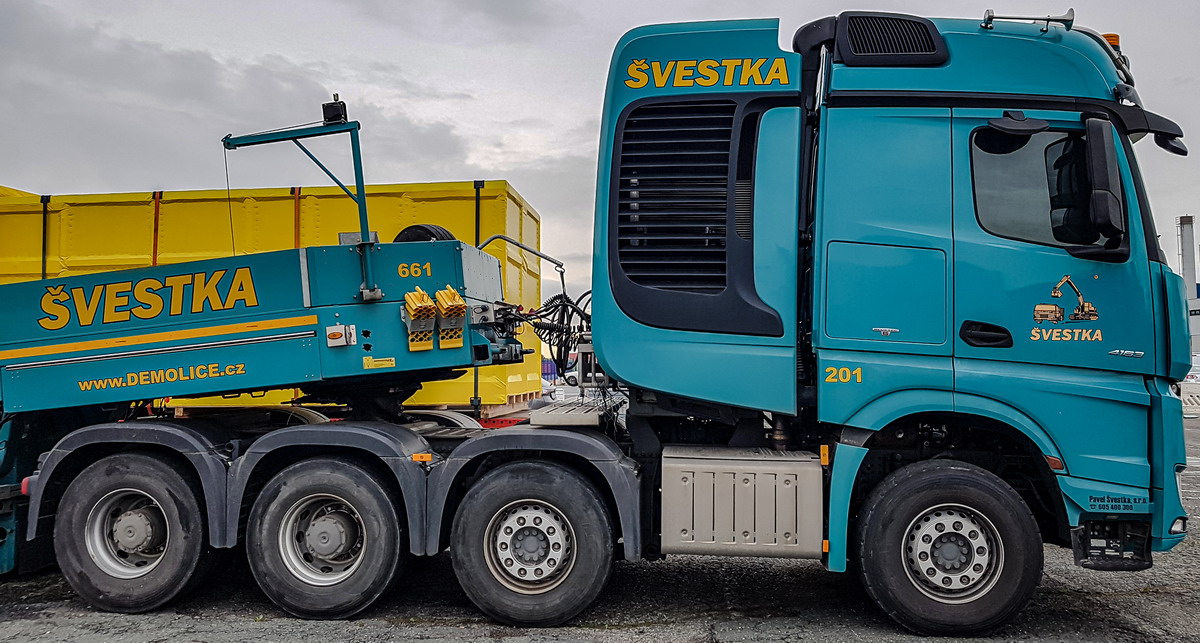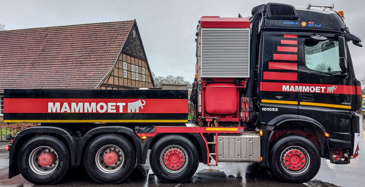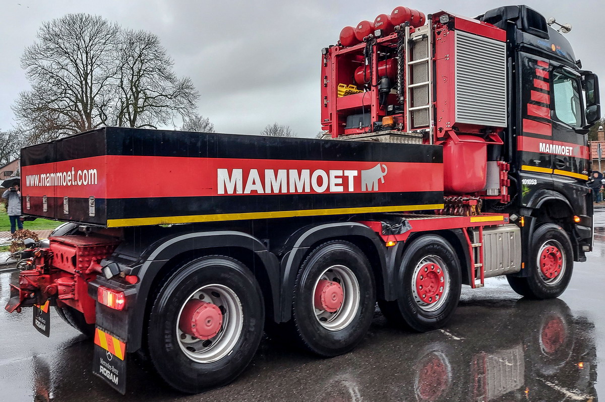 Ein Gespann wurde von Mammoet bewegt, dabei kamen sowohl als Zug- und Schubfahrzeug vierachsige Arocs zum Einsatz.