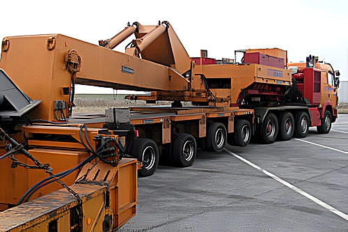 Mitte Januar 2003 kam dieses Schwertransport-Kombination im Konvoi mit dem dahinter stehenden Actros Titan aus dem Süden in den Hafen von Cuxhaven, um den neuen Liebherr-Hafenkran anzuliefern.