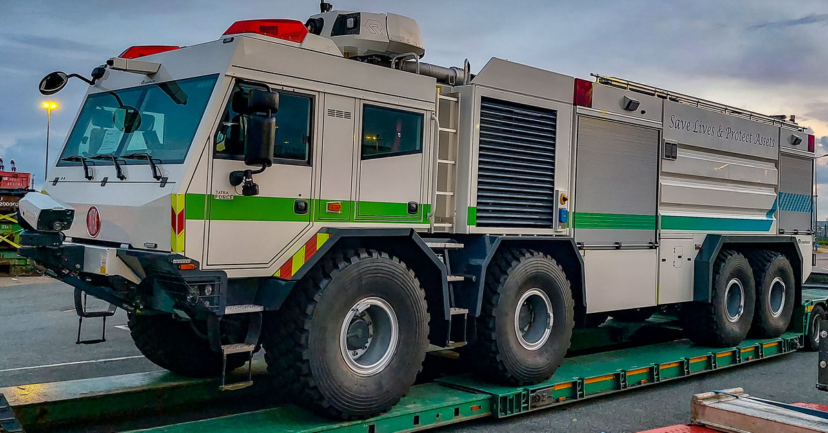 Im Flat Rack Im Sommer 2024 wurde mit diesem Gespann von Glomb eines von etlichen Flugfeld-Löschfahrzeugen im offenen Container (Fachbezeichnung Flat...