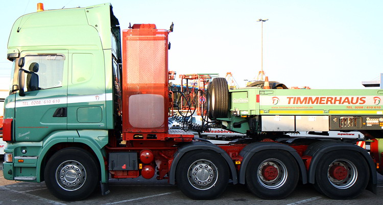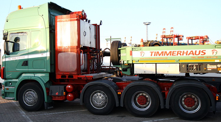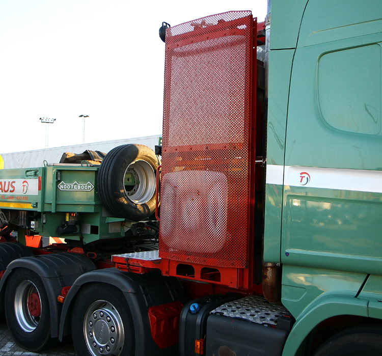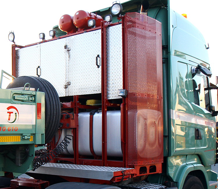 Hinter dem Fahrerhaus steht der Schwerlastturm mit dem Dieseltank.