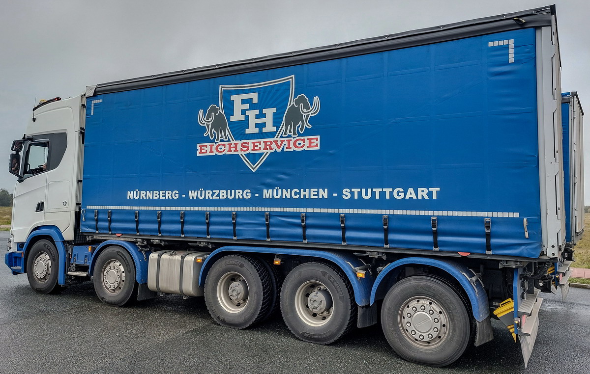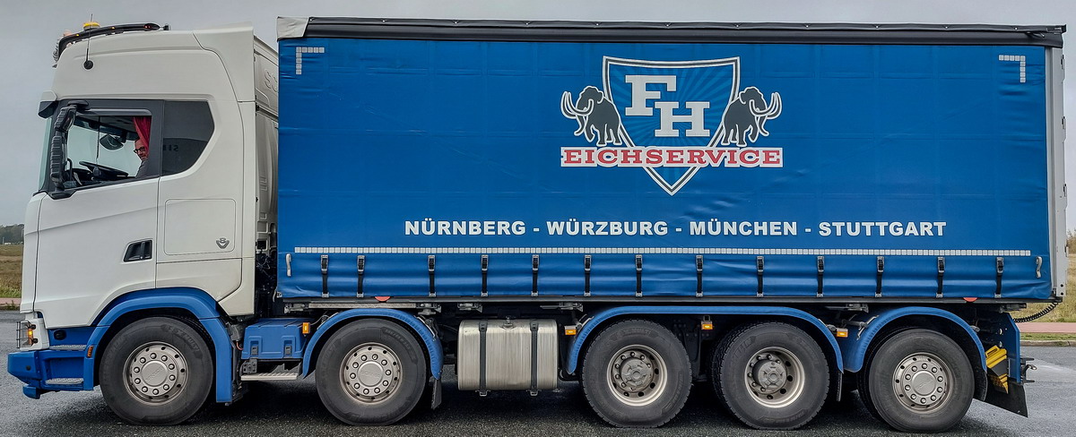 Auf der rechten Seite tragen beide Scania gravierte Verkleidungen mit den Schriftzügen vom Betreiber und dem Fahrzeugbauer.
