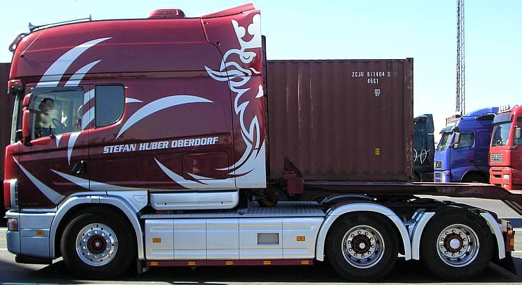Normalerweise sind die Trucks des Unternehmens aus Oberndorf auf Fleischtranporte spezialisiert, auch wenn hier nur ein normales Containerchassis gezogen wird.