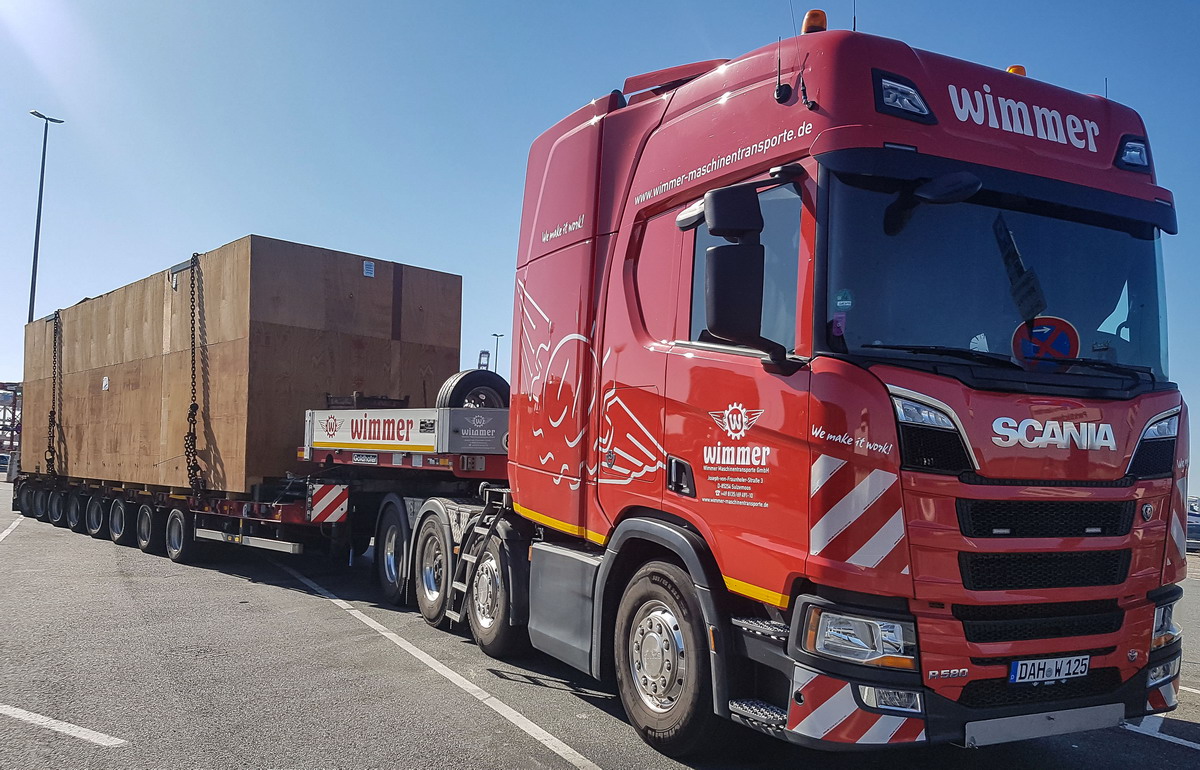 Der Goldhofer STZ-H8-78/80A darf mit Ladung ein Gesamtgewicht von 106 Tonnen auf die Straße bringen.