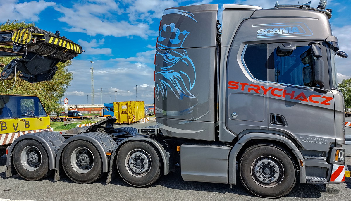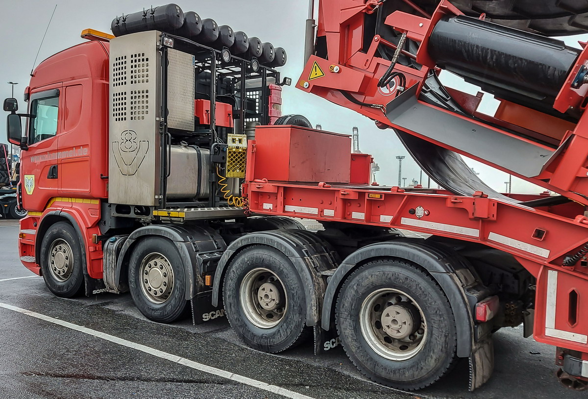 Dieser Scania von Wiesbauer, der im Herbst 2014 für Fotos bereit stand, hat eine identische Achskonfiguration. Auch in anderen Details sind Gemeinsamkeiten auszumachen. Die Anordnung der Druckkessel und andere Kleinigkeiten unterscheidet die beiden Schwerlaster.