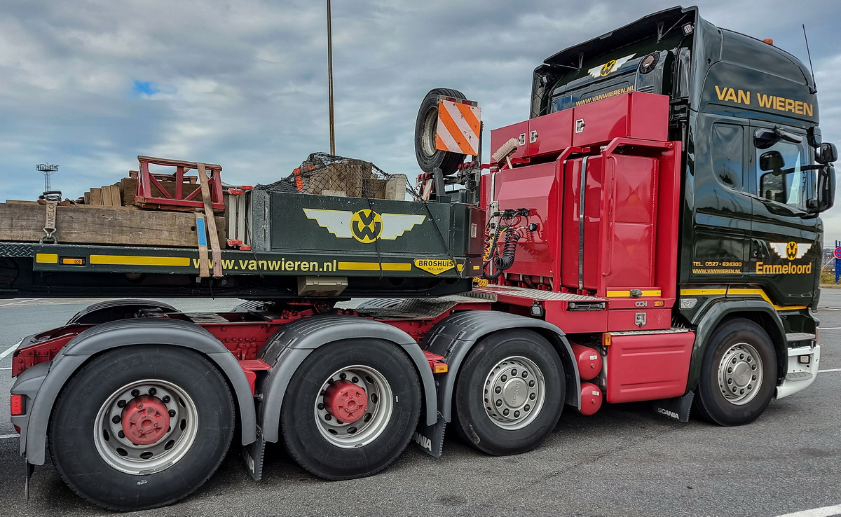 Logischerweise handelt es sich bei dem achtachsigen Auflieger um ein niederländisches Produkt