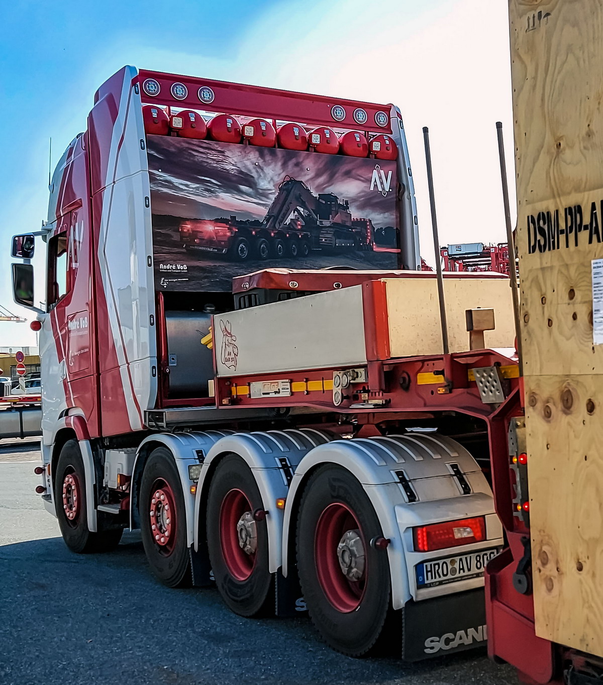 Das aktuelle schlichte Design von den beiden Mercedes Actros SLT 4163 wurde perfekt auf den Scania übertragen. Mit den lackierten Felgen und hinteren Kotflügeln ist der Vierachser eindeutig als echter "Voß" zu erkennen.