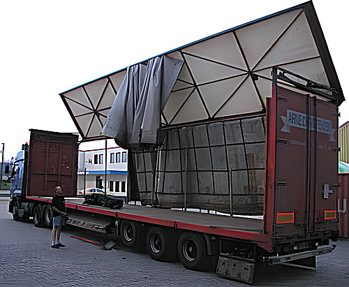 Wenn die Endposition erreicht ist, kann mit einem Kran ohne Probleme die Be- oder Entladung vorgenommen werden. Das Dach steht fast senkrecht und auch auf der Frontseite stört keine Abstützung oder Verstrebung.