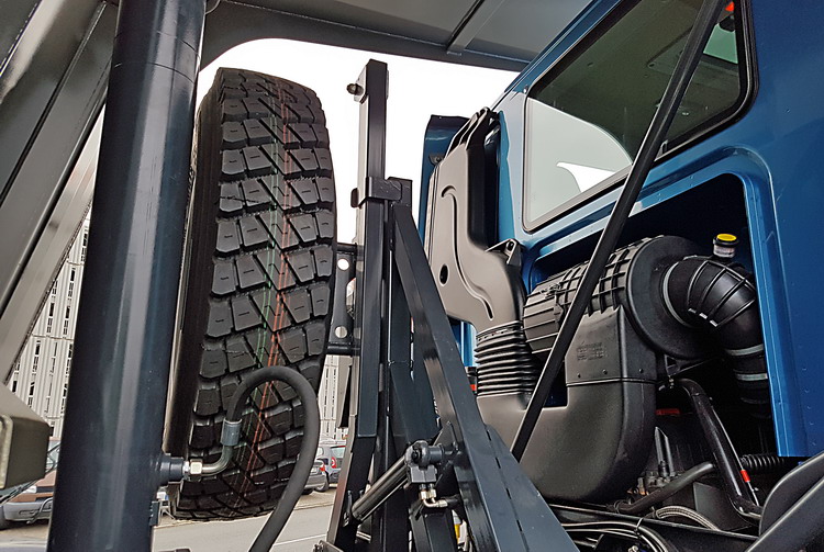 Für den Notfall ist hier ein Reserverad am hydraulischen Ausleger eingelagert.
