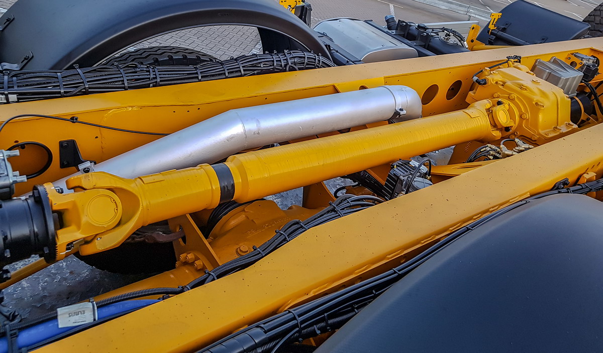 Von der Seite ist gut das Gehäuse der Kardanwelle zwischen den Achsen 1 und 2 zu erkennen.