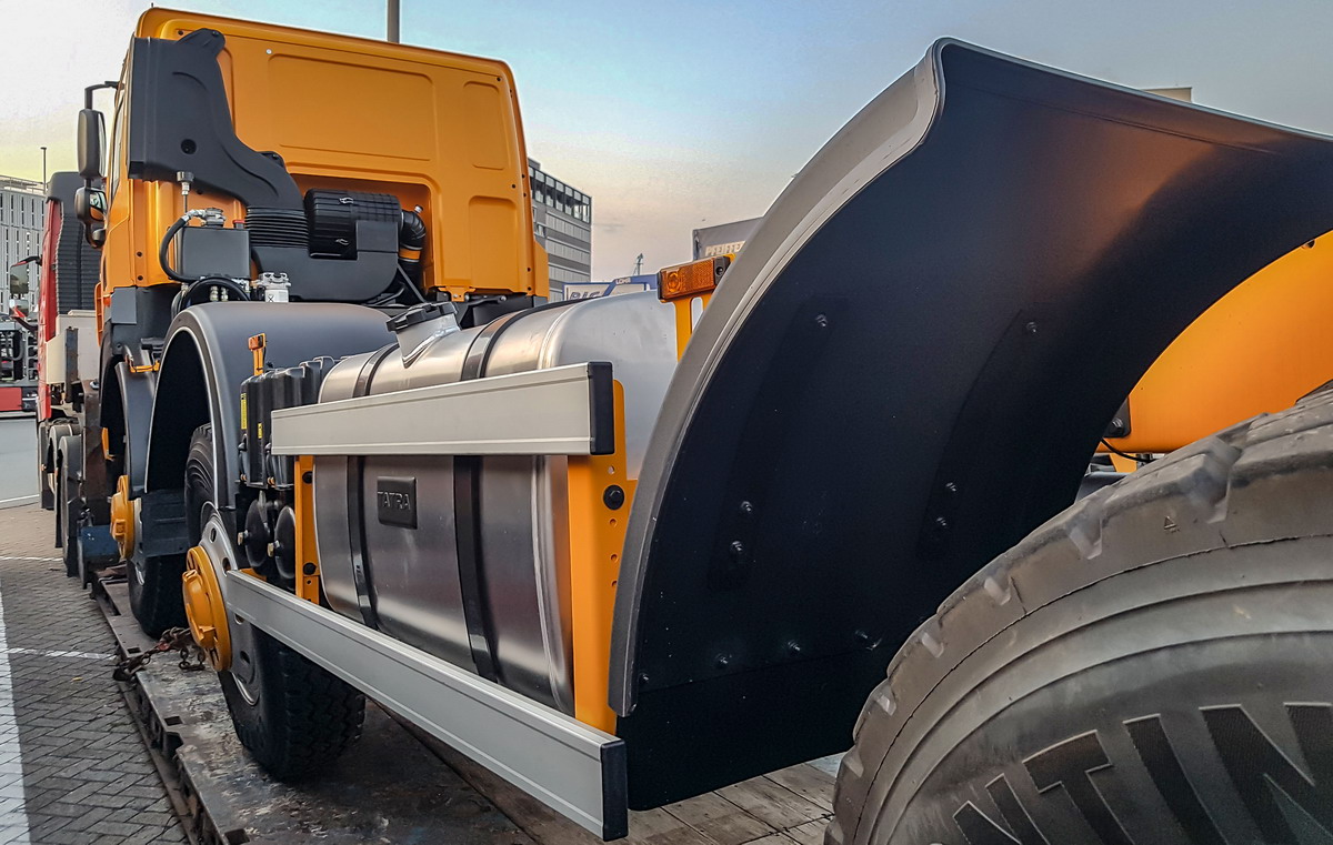 Das lange Fahrgestell verfügt über fünf Achsen, die sich auf eine Fahrzeuglänge von über 10,5 Metern verteilen.
