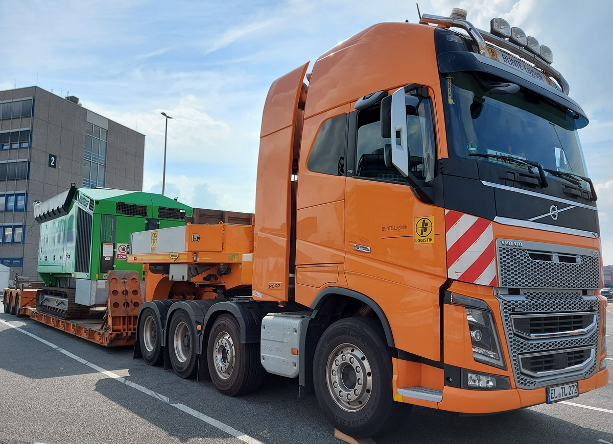 Geladen war eine TARGO 3000 Raupe, die als Shredder Altholz, Grünschnitt, Sperrmüll, Paletten und andere Materialien zerkleinert und durch die Raupenfahrwerke auch ins schwere Gelände gelangen kann.