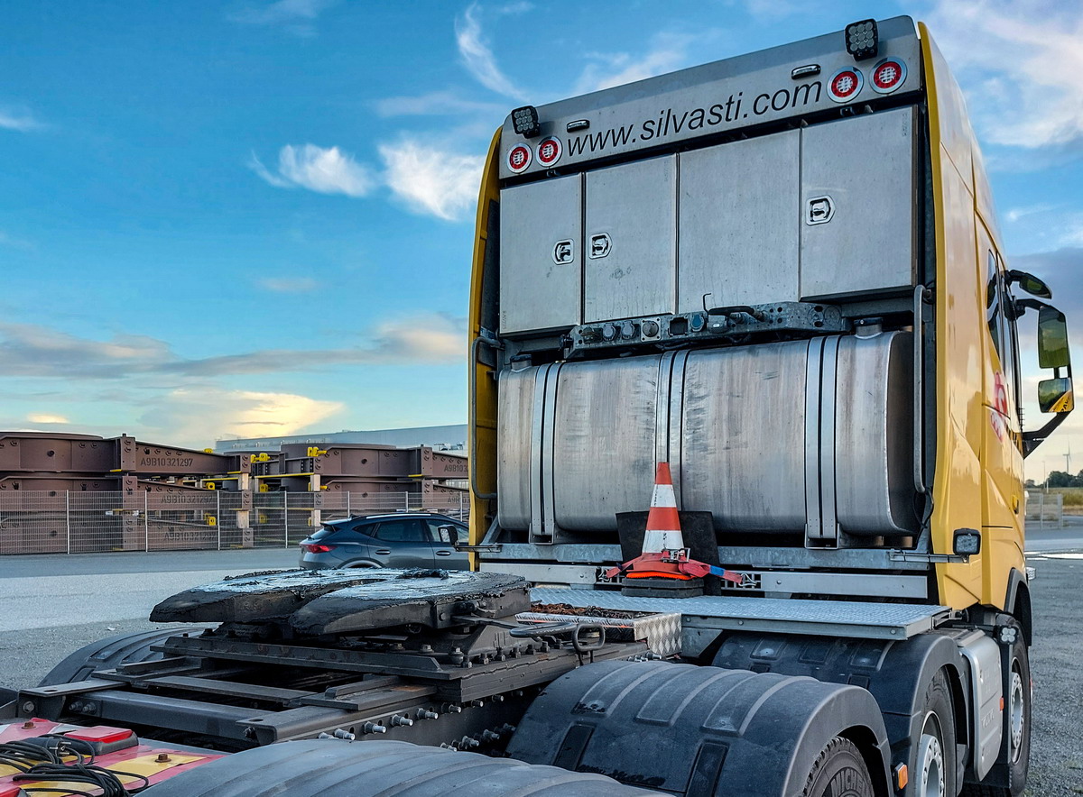 Warten auf Ladung In der Wartezone des Cuxhavener Windkraft-Hafens parkten im September 2022 einige Trucks von Prangl. Schon aus der Ferne geben sich die...